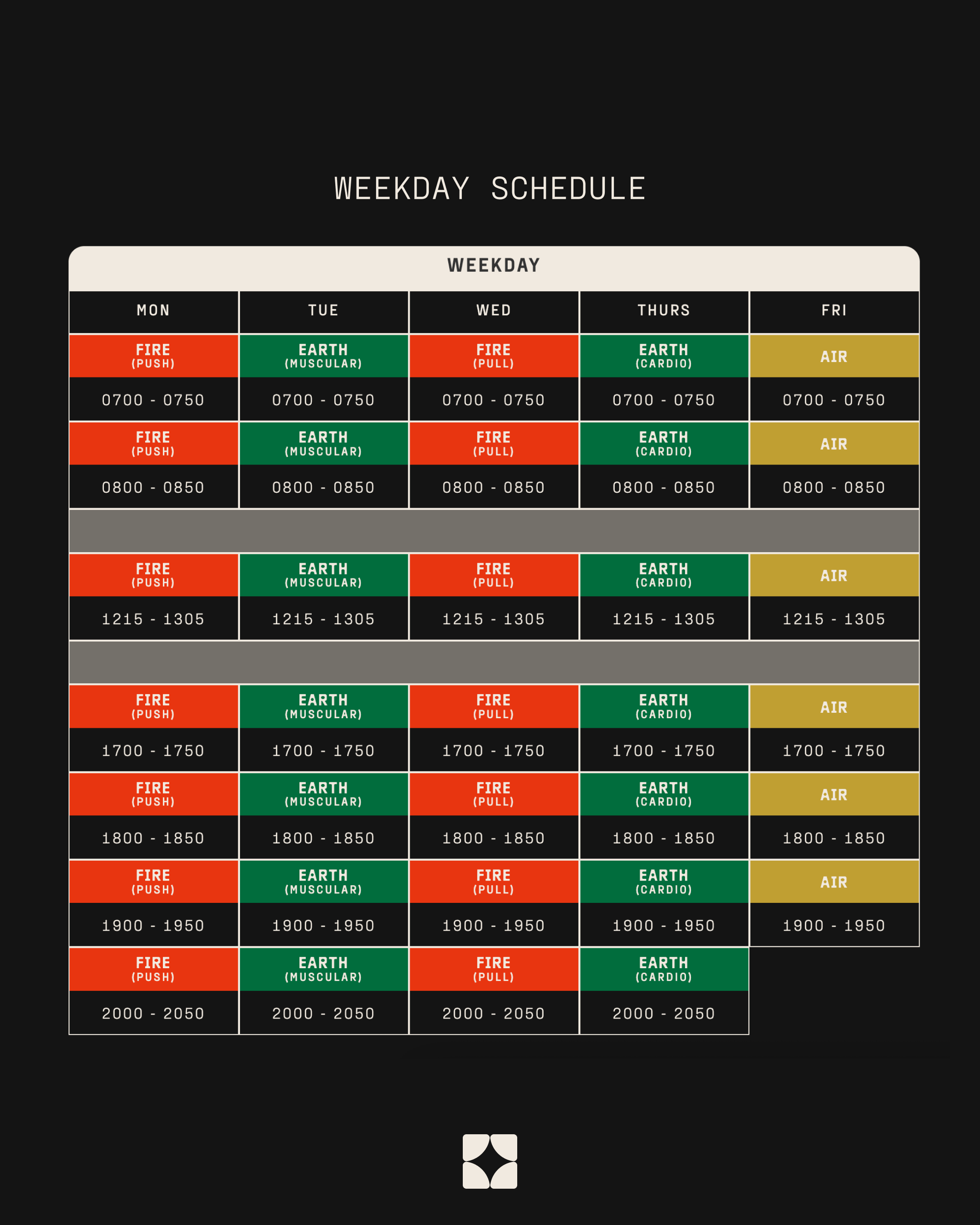 Your trial gives you unlimited access to our 4 signature classesβeach rooted in a natural element and designed to complement one another. Together, they offer a complete, holistic approach to fitness.
